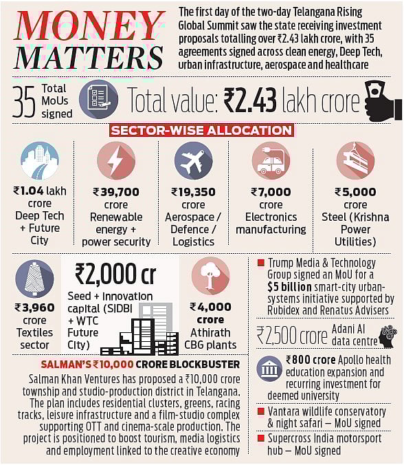 The two-day Summit was inaugurated by Governor Jishnu Dev Varma, who expressed confidence that the state could reach a $3 trillion economy by 2047. Among others present at the inaugural were Union Minister G Kishan Reddy, Deputy Chief Minister Mallu Bhatti Vikramarka, Karnataka Deputy Chief Minister DK Shivakumar, Nobel laureate Kailash Satyarthi, World Economic Forum executive Jeremy Jurgens, Trump Media and Technology Group director Eric Swider, TVS Supply Chain Solutions chairperson R Dinesh.